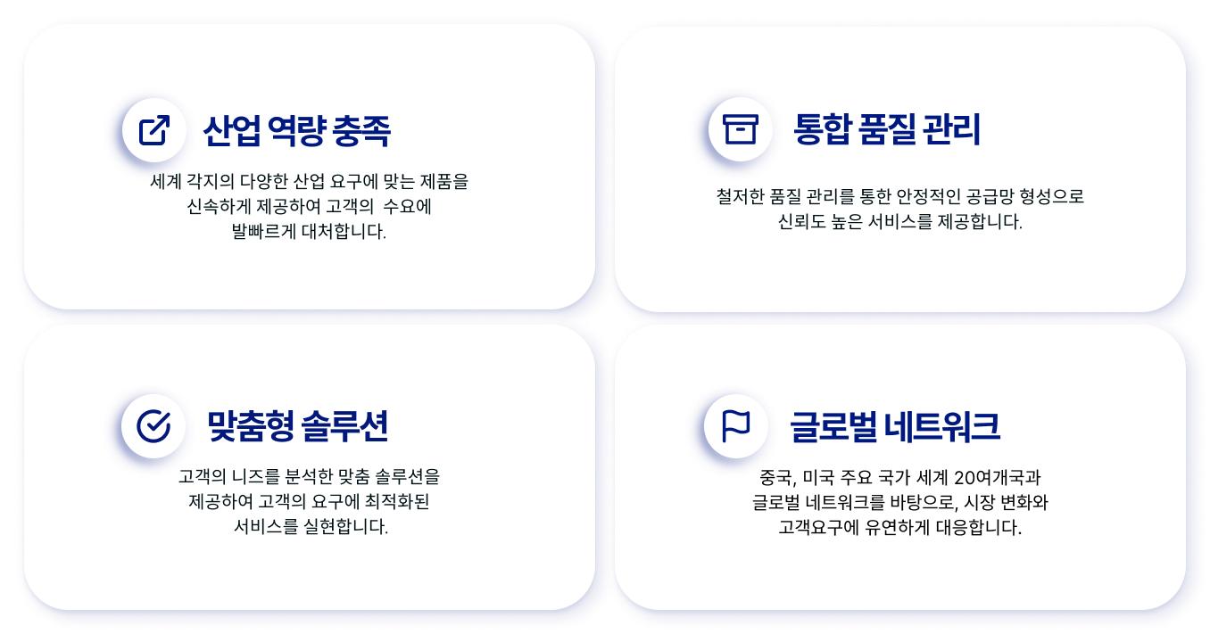 중국, 미국 주요 국가 세계 20여개국과 글로벌 교역을 통해 다양한 산업에 맞춤형 제품과 솔루션을 공급합니다.